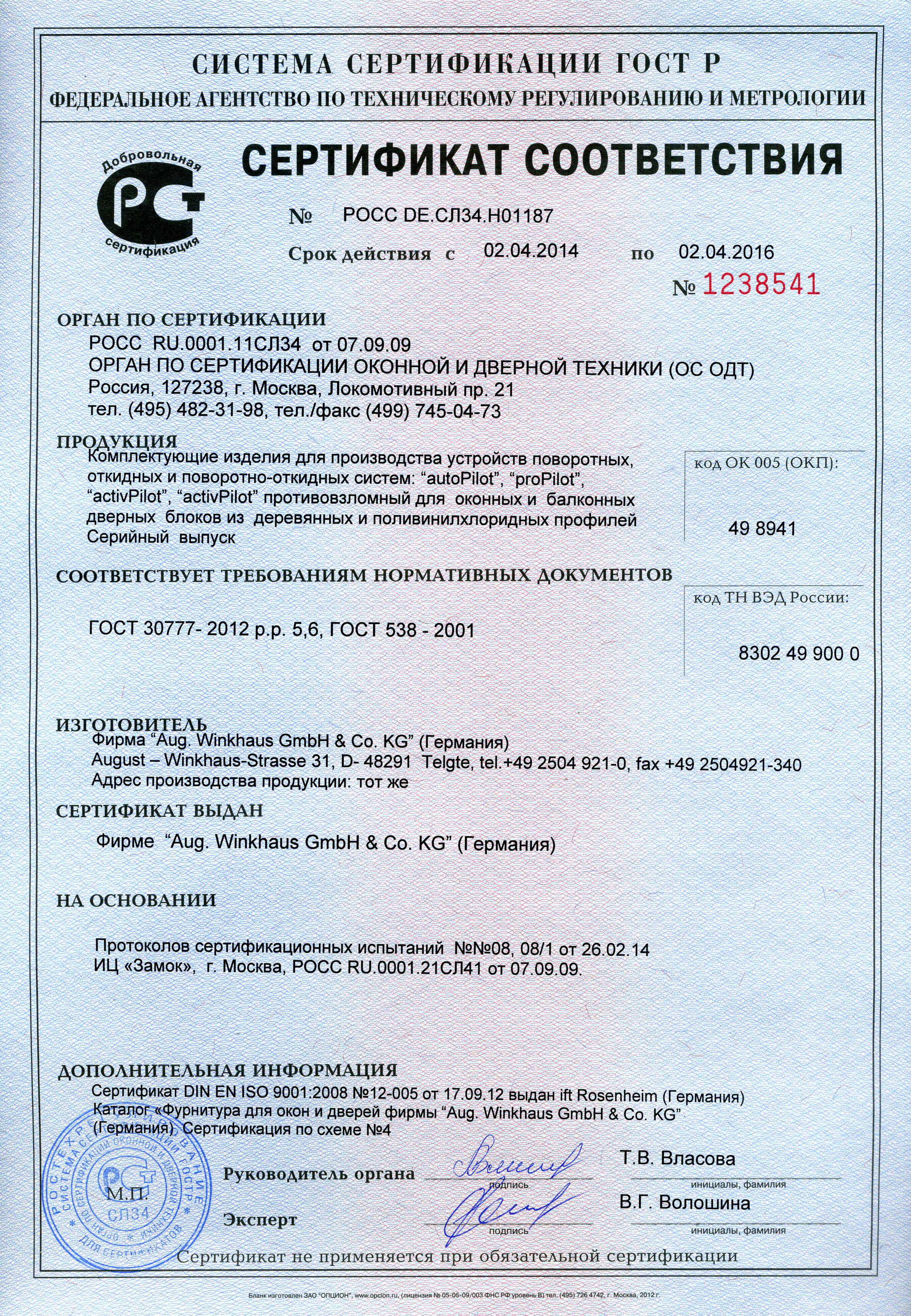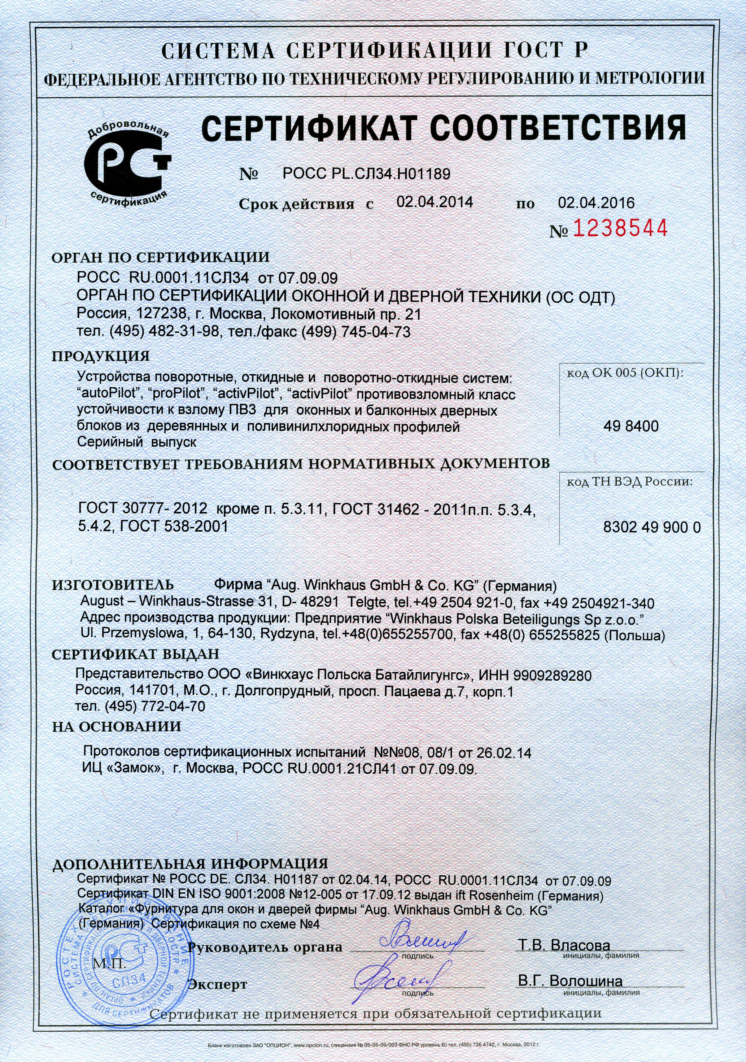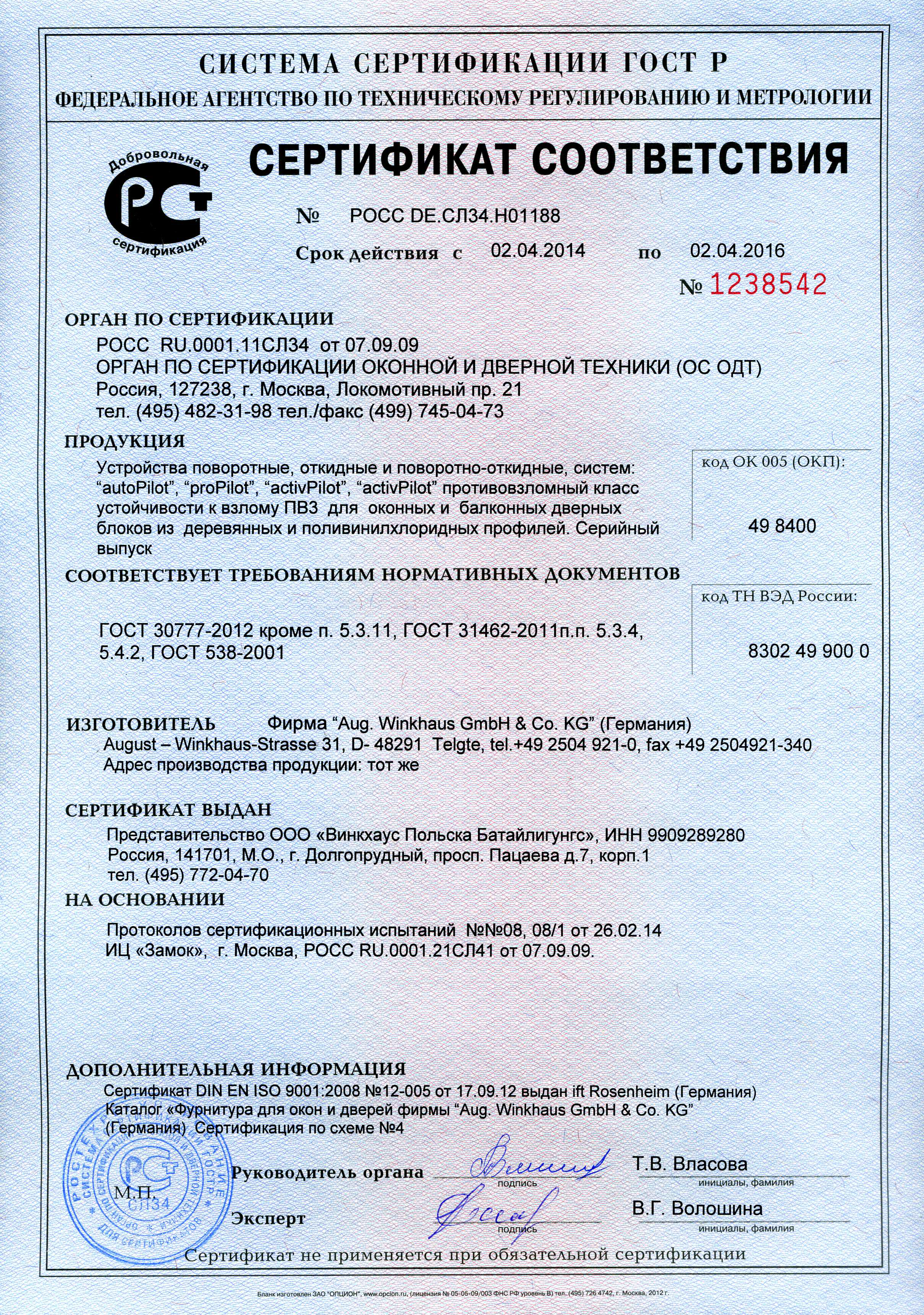 Сертификаты WINKHAUS