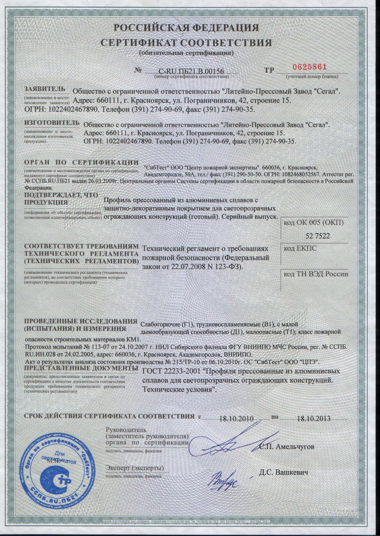 Сертификат пожарной безопасности C-RU.ПБ12.В.00124