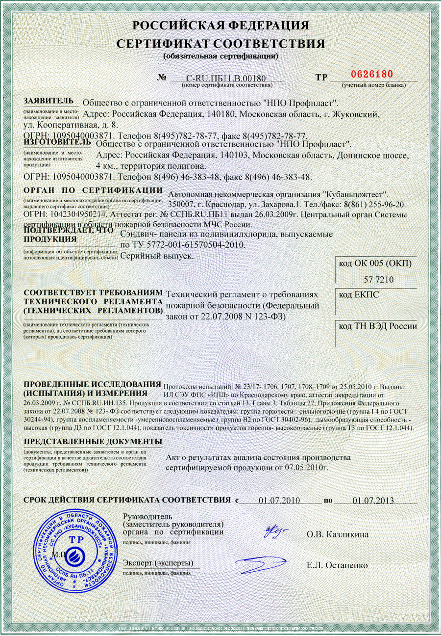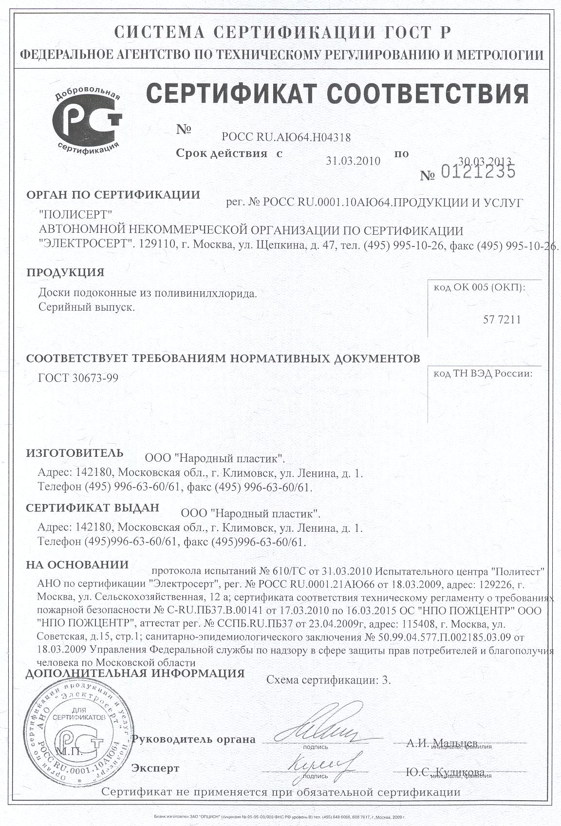 | Сертификат-НПО-Профпласт | Сертификат соответствия на Подоконник |